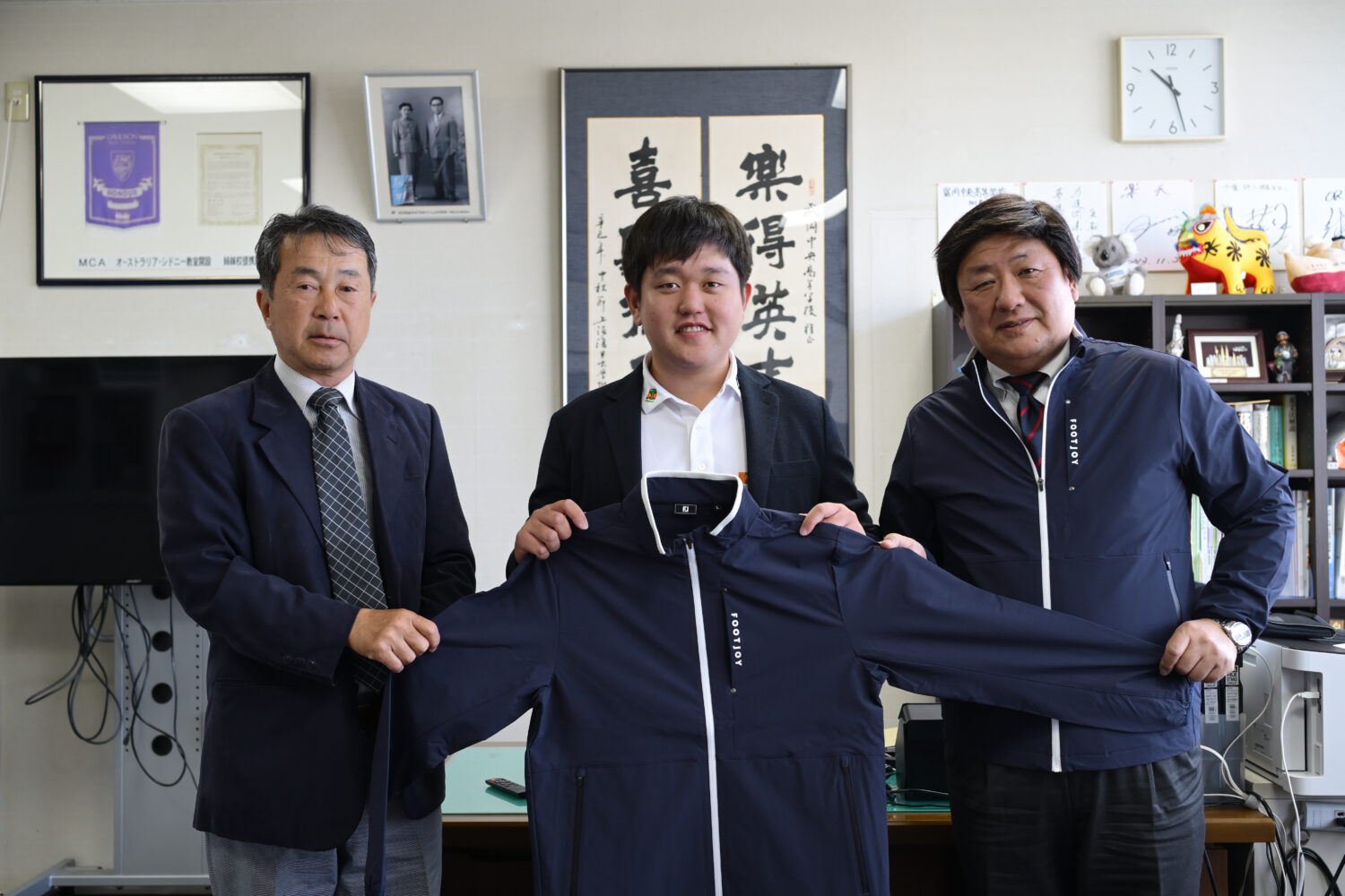 また、このたび米沢選手より、ゴルフ部へウィンドブレーカーを寄贈いただきました。先輩からの温かいご支援に、心より感謝申し上げます。