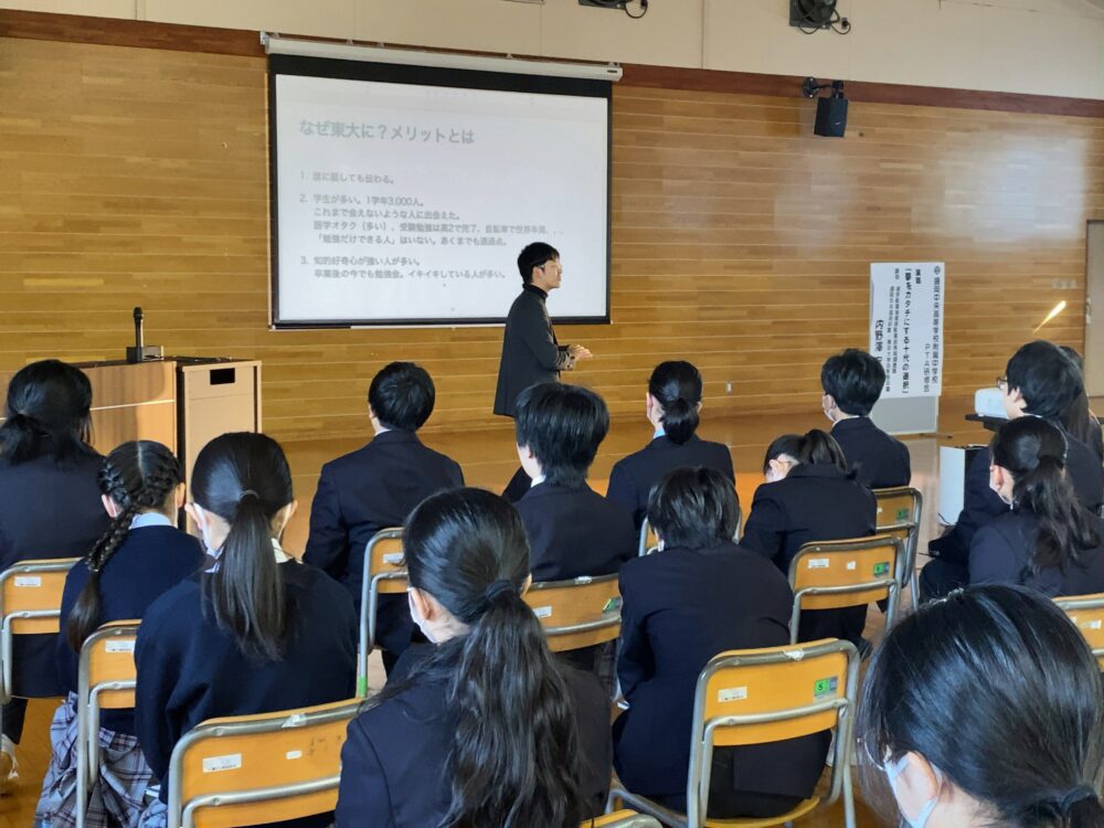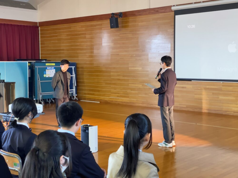 第一部では、盛岡中央高校の卒業生(2018年卒)で、東京大学文科1類を卒業され、現在は株式会社みずほ銀行に勤務されている内野澤 安紀 氏をお招きし、講演会を行いました 。「夢をカタチにする10代の選択」という演題のもと 、附属中学生 、高校1V・2V生徒 、そして参加された保護者の皆様 が、先輩の貴重なお話に熱心に耳を傾けました。