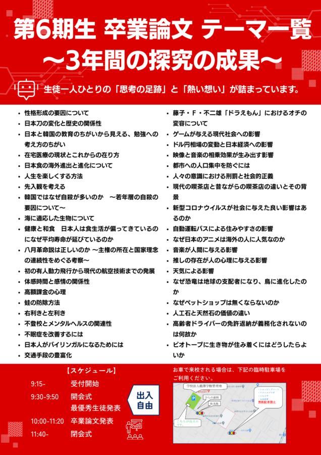 先日お知らせいたしました、中学3年生(6期生)による「卒業論文発表会」につきまして、詳細な時程が決定し、二次案内のチラシが完成いたしました。