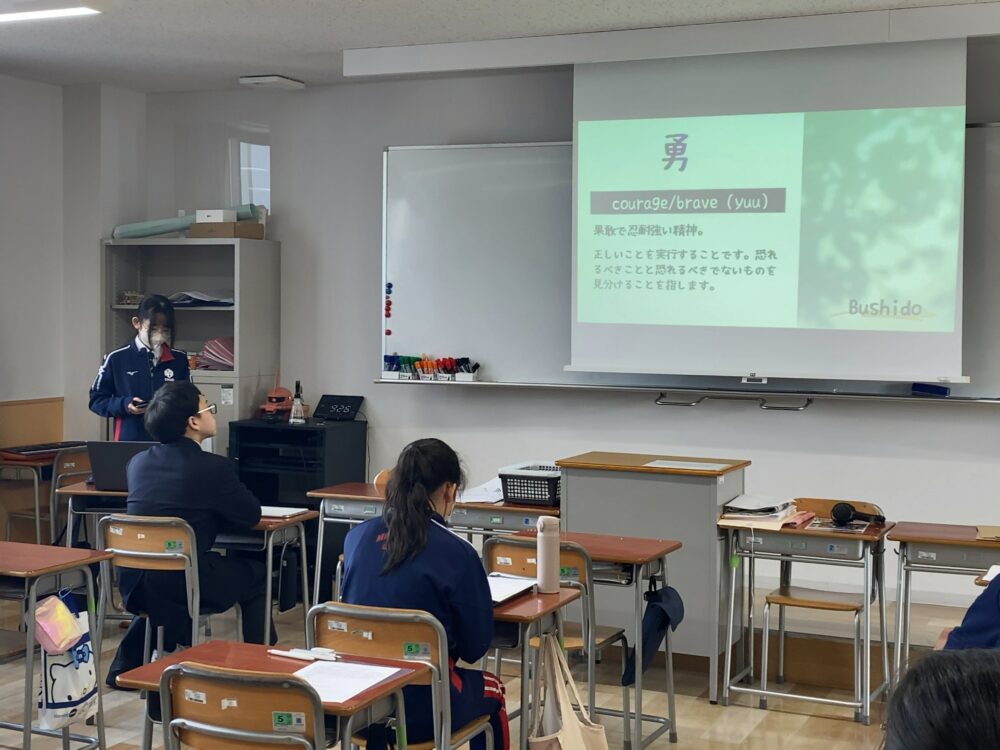本校が位置する岩手県盛岡市は、世界的名著『武士道』の著者である新渡戸稲造の生誕の地です。中学1年生は今年1年間、探究学習の時間を使い、この「武士道」について深く学んできました。 今回の発表会はその集大成として、生徒一人ひとりが現代社会において大切にすべき精神を「令和版武士道」として定義し、スライドにまとめてプレゼンテーションを行いました。